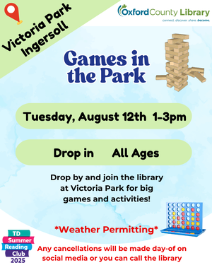 1pm ING-Games in the Park Tuesday, Aug. 12, 1pm![]() Ingersoll Library Victoria Park Ingersoll - Weather PermittingDrop in 1-3pmAll agesDrop by Victoria Park Ingersoll and join the library for big games and activities!Any cancellations due to weather will be made day-of and posted on social media or you can call the branch to verify.