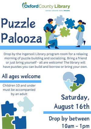 10am ING-Puzzle Palooza Saturday, Aug. 16, 10am![]() Ingersoll Library Drop by the Ingersoll Library program room between 10am-1pm for a relaxing morning of puzzle building and socializing. Bring a friend or just bring yourself - all are welcome! The library will have puzzles you can build and borrow or bring your own.All ages welcome - Children 10 and under must be ac...read more