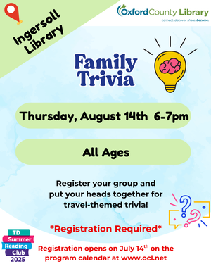 6pm ING-Family Trivia Thursday, Aug. 14, 6pm![]() Ingersoll Library Registration required - Registration opens on July 14th All ages Register your group and put your heads together for travel-themed trivia!